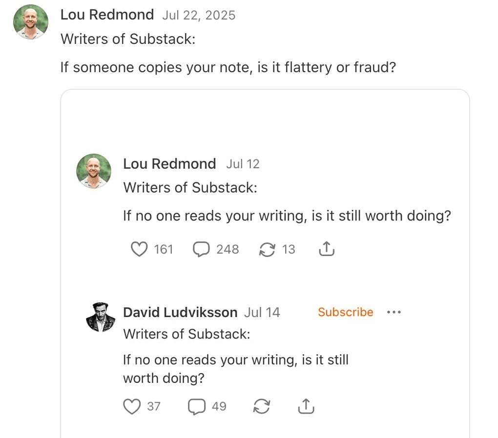 I found someone on Substack had posted the same post, word-for-word. Not that my idea was completely original, but I knew this guy, like many Substackers, was trying to use proven formulas to hack the system.
